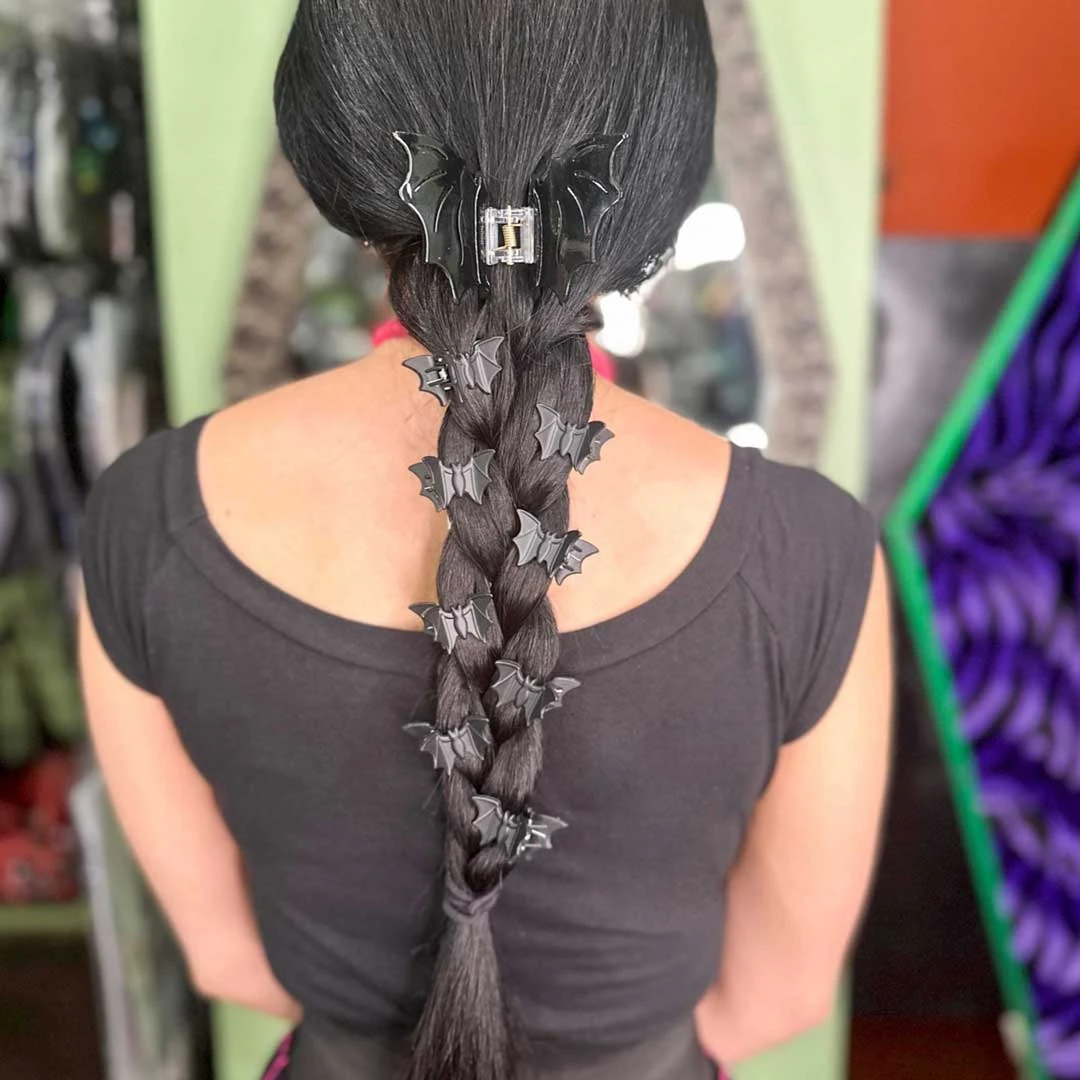 Match your hair to your vampire aesthetic with the Bat Mini Claw Clip Set in Black. This gothic inspired hair accessory comes in a set of 4 mini clips. No butterflies here, go Y2K vamp with mini bats flying around your hair. Made with spring clips and matte black acrylic. Clip size approx 0.75″ H (2 cm) x 1″ W (2.5 cm).