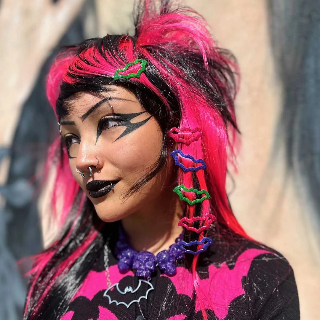 Kreepsville Snap Hair Clips Multicolor. Whether you are a baby bat or a veteran vampire, feel cute and spooky in our bat shaped hair clips! Set of 6 clips in 3 colors, made with alloy metal with sparkly glitter gloss gel finish. Designed by ghouls in the USA! Clip size: 2″ (5cm) x .9″ (2.2cm).