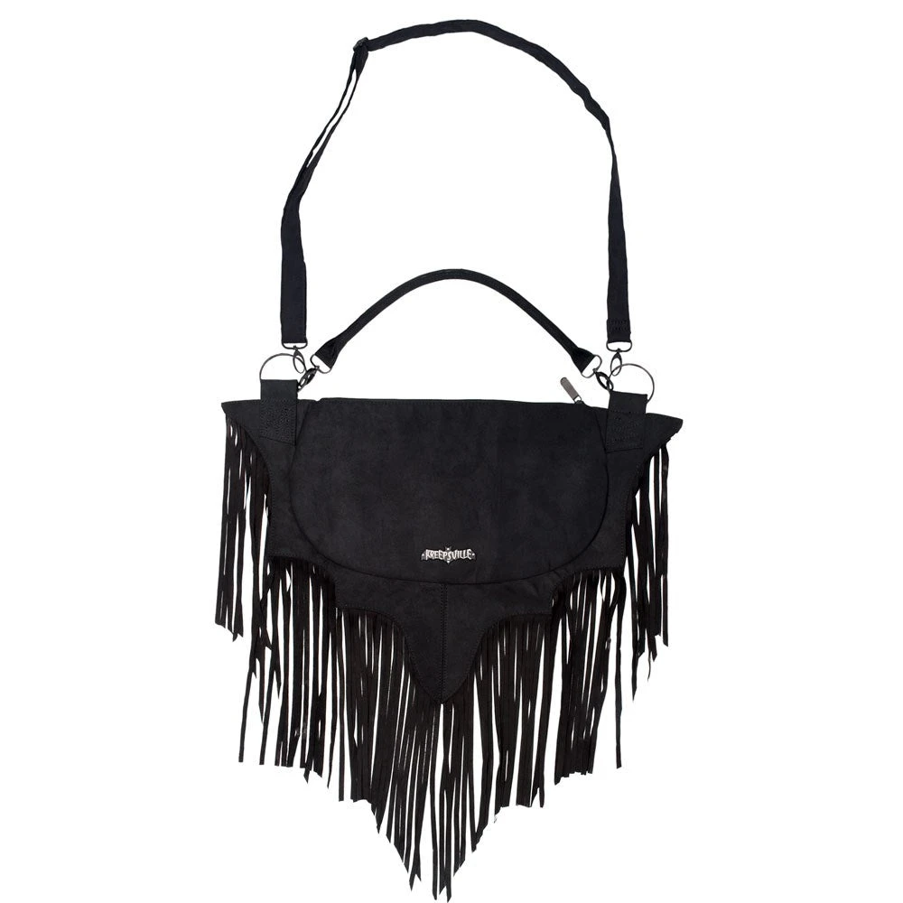 Kreepsville 666 bat wing fringe shoulder purse bag with detachable chain detail shoulder strap. Also includes a detachable and adjustable long shoulder strap to turn instantly into cross body purse bag. Made from vegan suede . Kreepsville 666 grey and black lining, inside pockets with Kreepsville 666 logo badge on front and 9 inch fringe. Overall bat size approx 21in (53cm) w x 13.75 in (35 cm) h, internal bag size 14 in (35.5cm) w x 8.5 in (21.5cm) h.