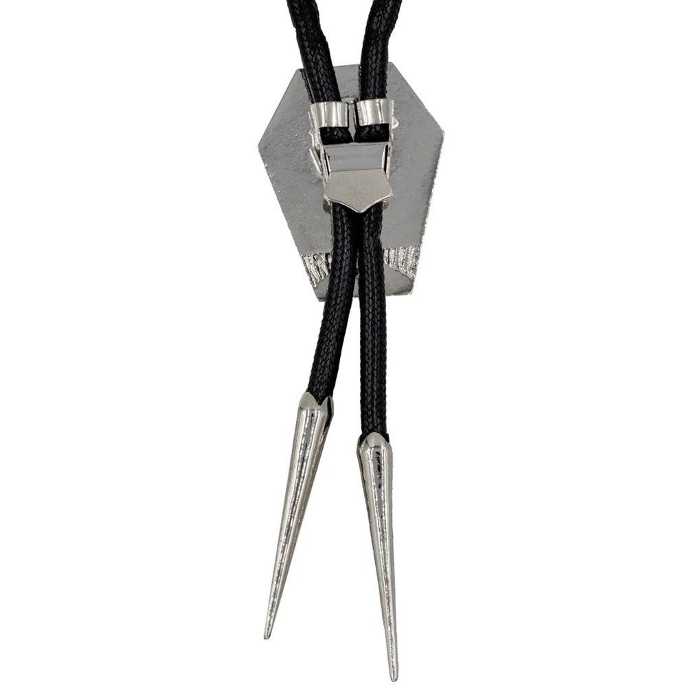 Awaken from the dead and add some gothic western flair to your wardrobe with the Coffin Skull Bones Bolo Western Tie by Kreepsville! This retro bootlace tie features a black coffin slide with white harlock style skull design and tapered spike tips made of chrome finished alloy metal on a black braided nylon cord. The coffin slide secures tightly on the back for the perfect fit no matter what you wear it with. Complete a spooky cowboy or teddy boy inspired look with this rock n’ roll accessory! Cord length approx 36″ (92 cm), slide approx 1.5″ W (4 cm) x 2″ L (5 cm), and metal tips approx 2″ L (5 cm). Designed in California.