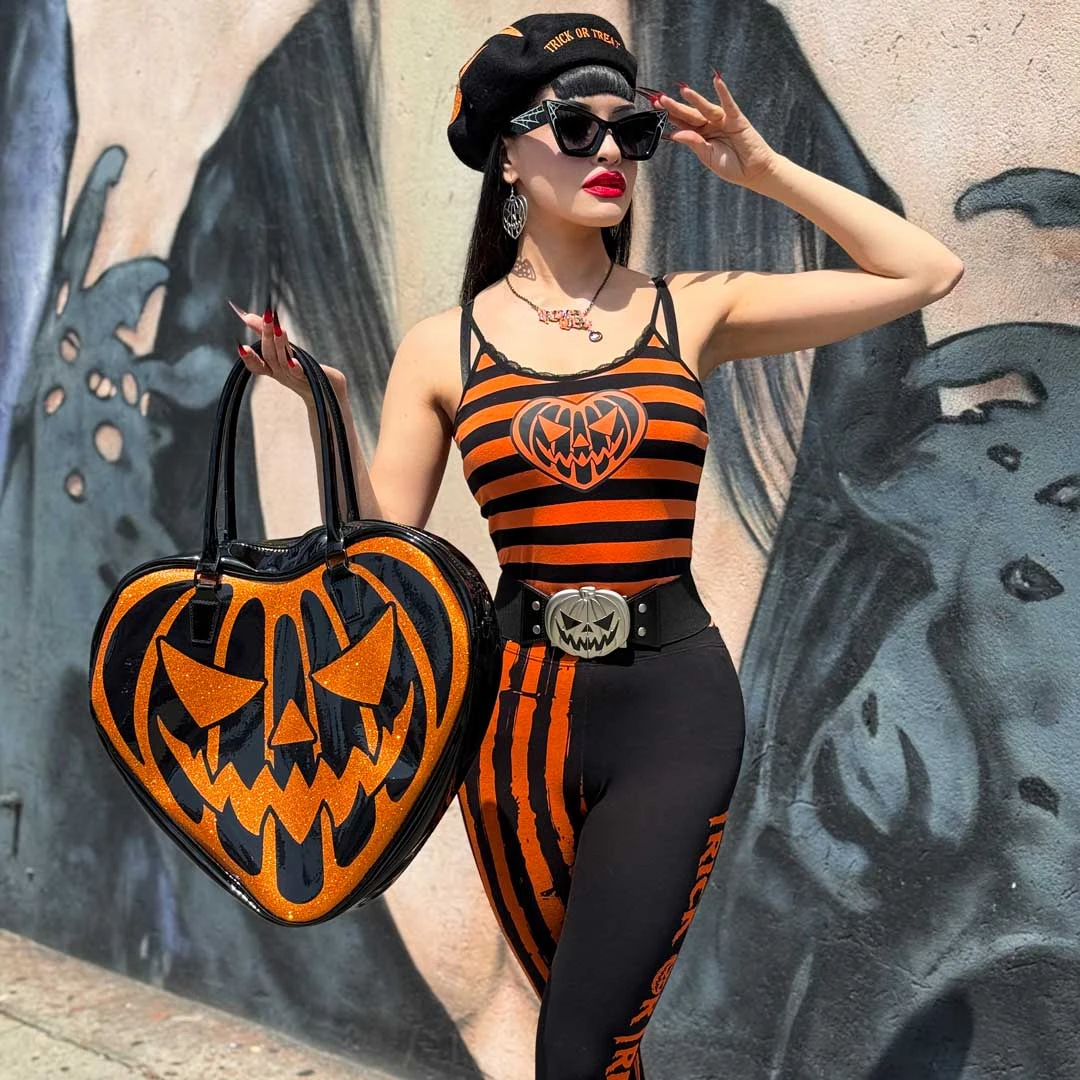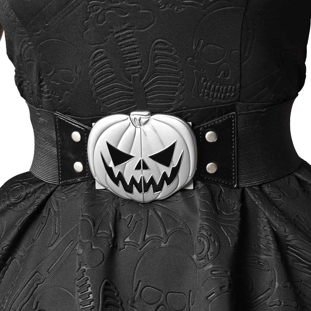 Get into the spirit of spooky with our Trick or Treat Pumpkin elastic waist belt by Kreepsville! Its retro style, soft elastic and high stretch black waist belt cinches your waist in the most alluring and comfortable way! Featuring a silver matte pumpkin metal alloy finish, its scary good interlock buckles will ensure a firm hold. Whether you’re tricking or treating (or both), this classic Halloween icon belt is perfect for a spooktacular night out or showing your love for all things Halloween year round! Sizes approx: Buckle when closed approx 5.4 in (14cm) wide. Available in 3 waist sizes: S-M ( Fits 24- 30 IN), L-XL ( Fits 30 – 38 IN) and 2XL-3XL (Fits 38- 44 IN).