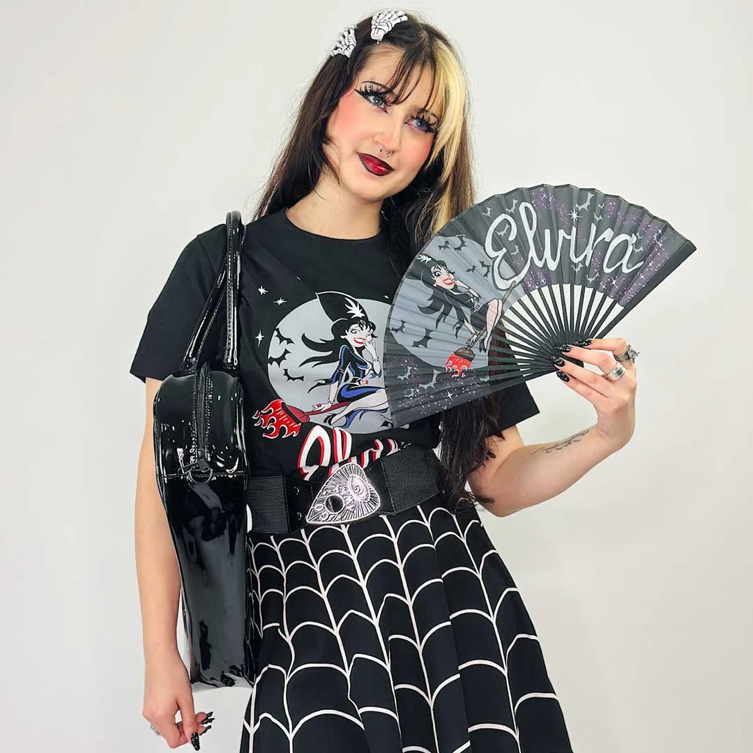 Elvira is back and more bewitching than ever with this Officially licensed Elvira Bewitched Fabric Fan by Kreepsville! This fan is the perfect comfort piece to take to a spooky cemetery or any dark and stormy night! The fan is made of high quality fabric and black bamboo frame. Expands up to 16″ inches (40cm) x Height 9.25″ inches (23.4cm).