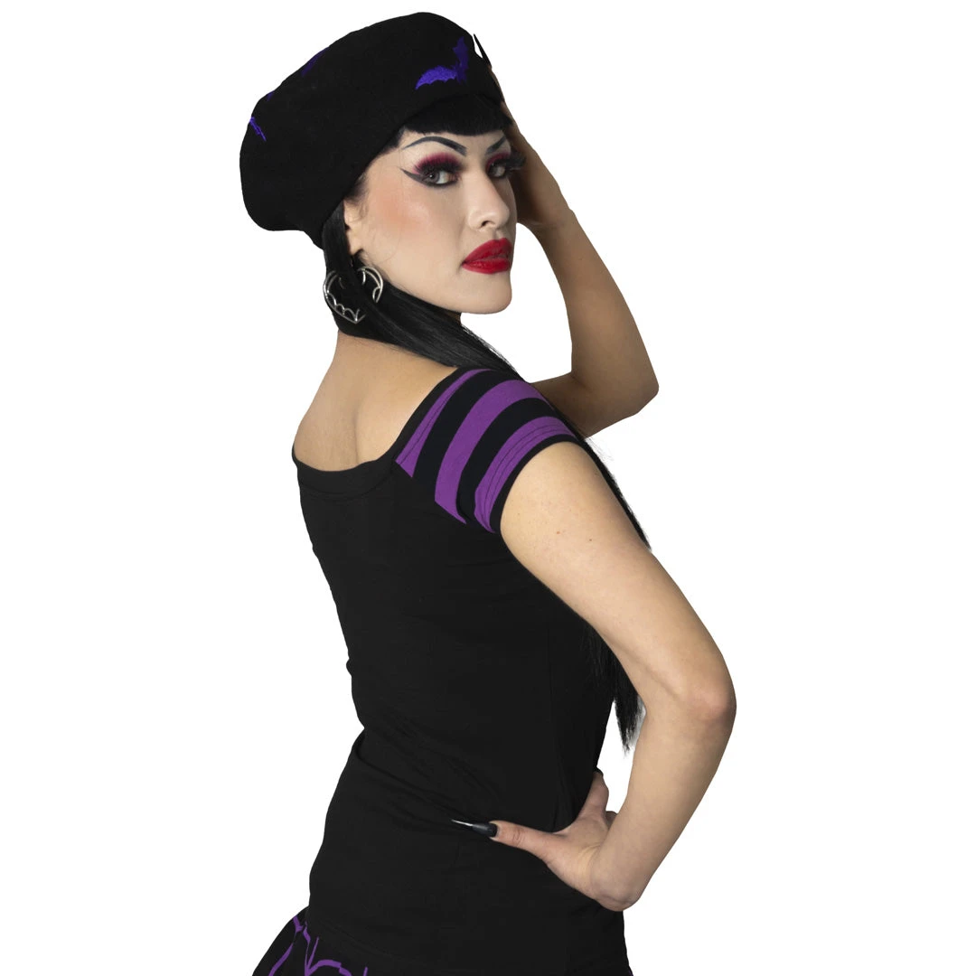 Officially licensed Elvira Moon Crescent Glitter Shoulder Top by Kreepsville. Features a sexy pin-up rendition of Elvira Mistress of the Dark sprinkled with purple glitter and purple and black stripe sleeve detail printed on a scary soft 95% cotton and 5% spandex shoulder tee. The classic shoulder top shape and striped sleeve details create a flattering silhouette for all body types! Art by Pin-up artist Valentina Rufo. Designed in California.