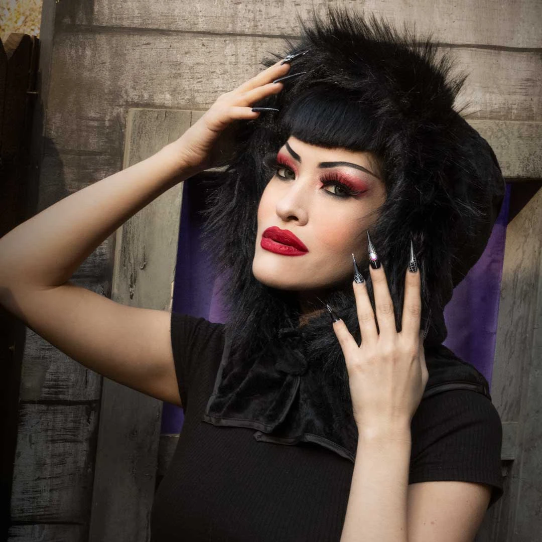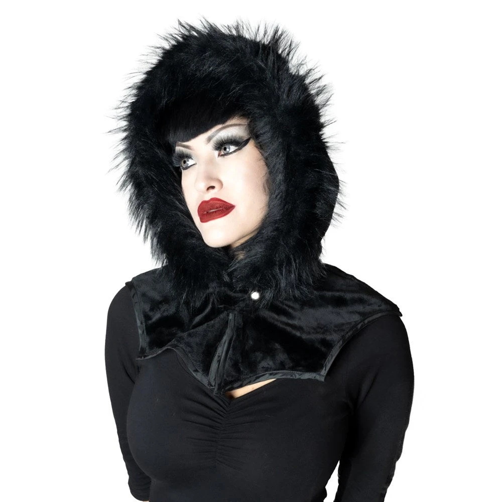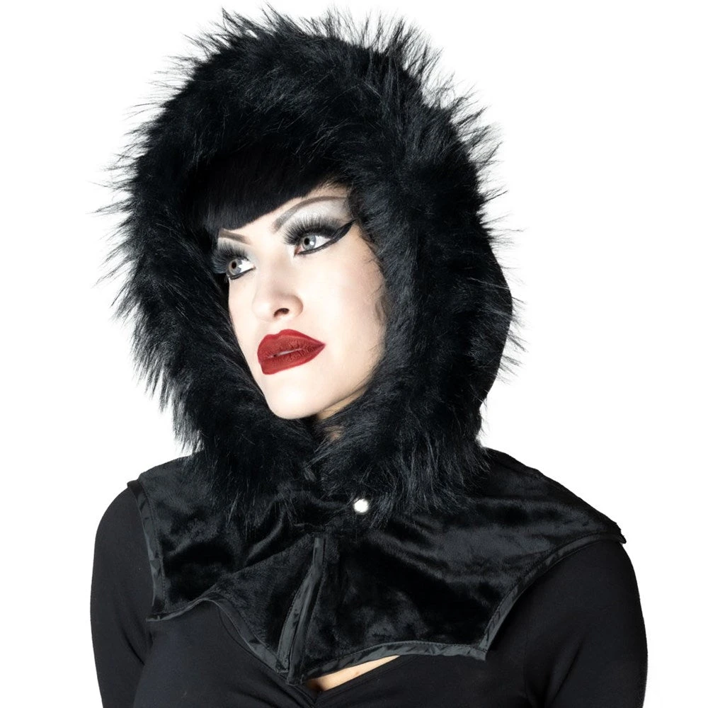 Glamour ghouls get ready for the spooky cold season with the Kreepsville Glamour Black Horror Hood. This vintage inspired gothic hood is designed to creep you warm and cozy all year round. Get ready to make a statement as you put on this plush, velvety faux fur hood, complete with vegan faux fur trim and a luxurious satin lining that won’t damage your hair. Fear not the cold winds, with its bat inspired collar and snap closures, this hood fits all head sizes and will stay secure and comfortable. Designed in California.