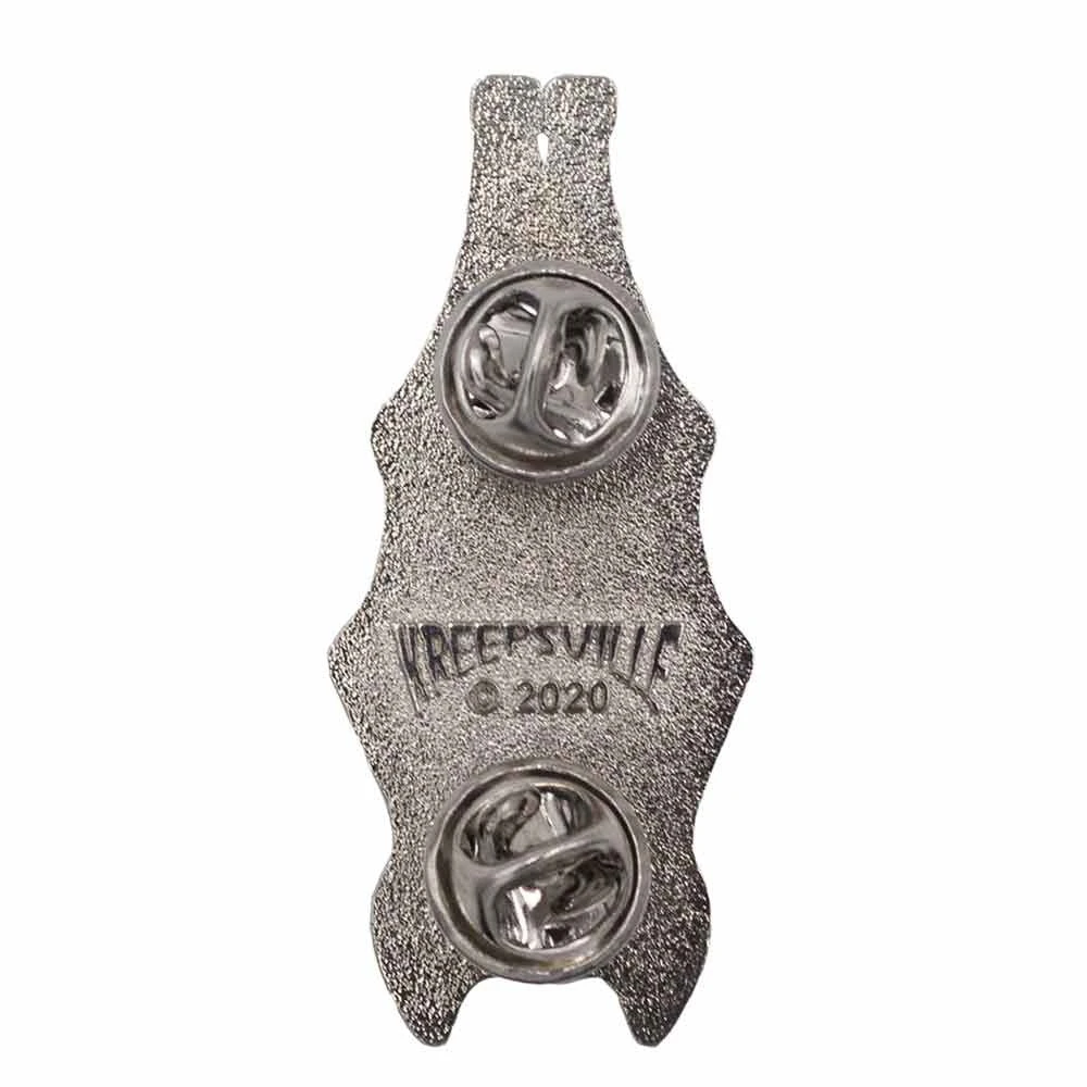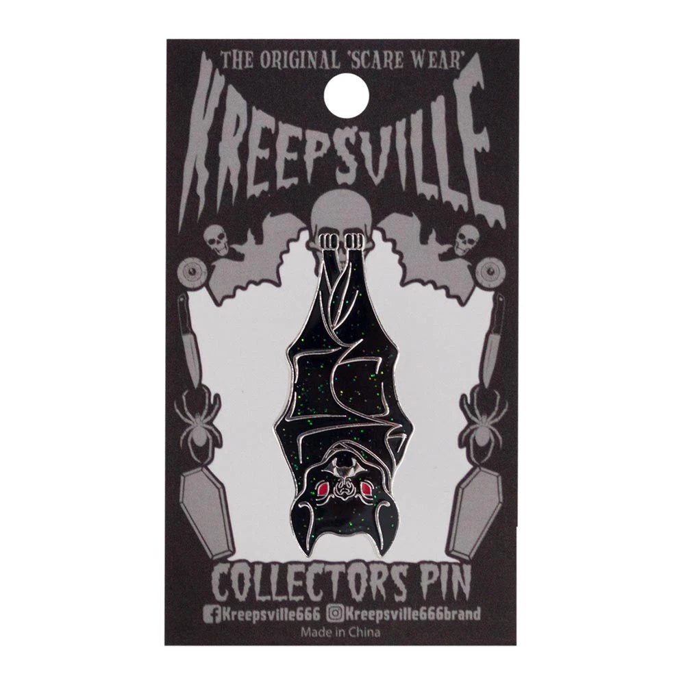 Kreepsville 666 Hanging Bat Glitter Enamel Pin, gloss finish with multi color glitter. Height approx 2 in (2.5cm)
