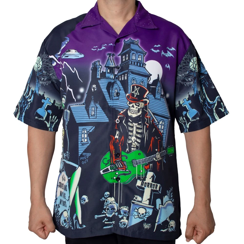 Rock and roll with our Haunted House sublimation shirt by Kreepsville! This super soft and loose fit camp shirt. The retro design features spooky pinups and ghoulish greasers, created by renowned lowbrow rockabilly artist Vince Ray. This button down shirt with lay flat collar is perfect for any occasion. Made from 100% polyester, its vivid colors are perfect for whether you’re rockin’ out at a psychobilly show or getting your groove on at a rockabilly dance off, this button down will keep you looking classy while you’re swinging the night away!