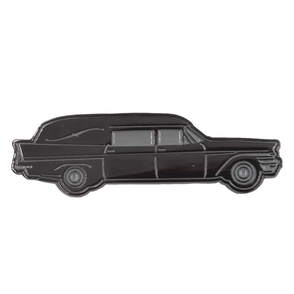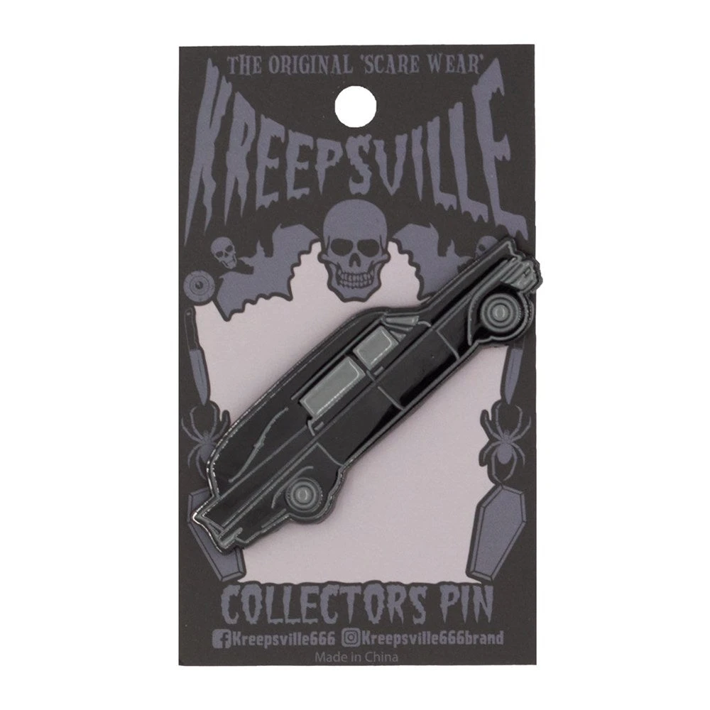 Kreepsville Hearse enamel pin, black metal chrome finish, approx 2.5 inches (w) (7.5cm).