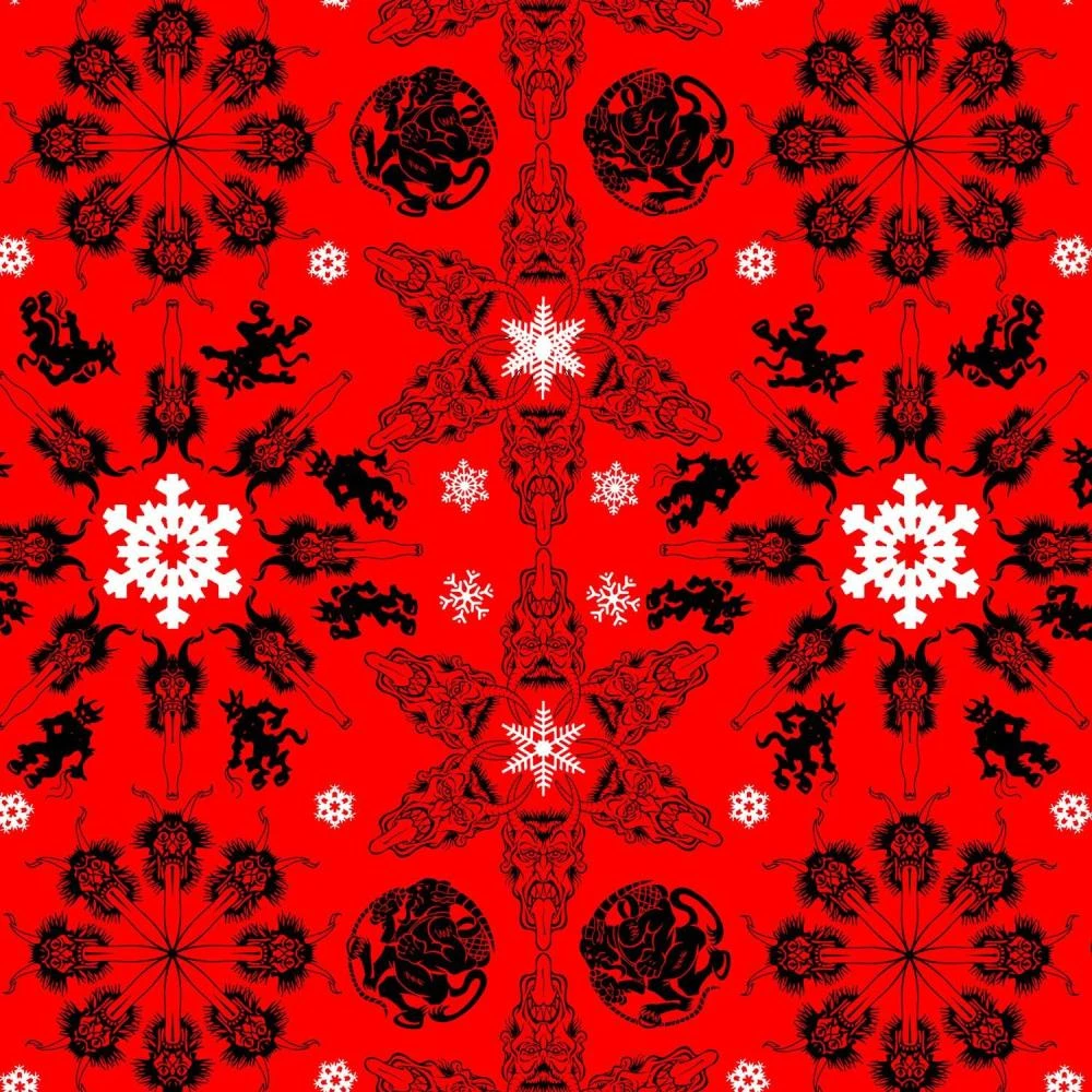 Kreespville 666 Krampus xmas print flare dress,skater style flared dress with 3/4 sleeve detail. 100% Polyester flare sublimation print with black 95% cotton 5% lycra sleeves and back. Made by monsters in the USA