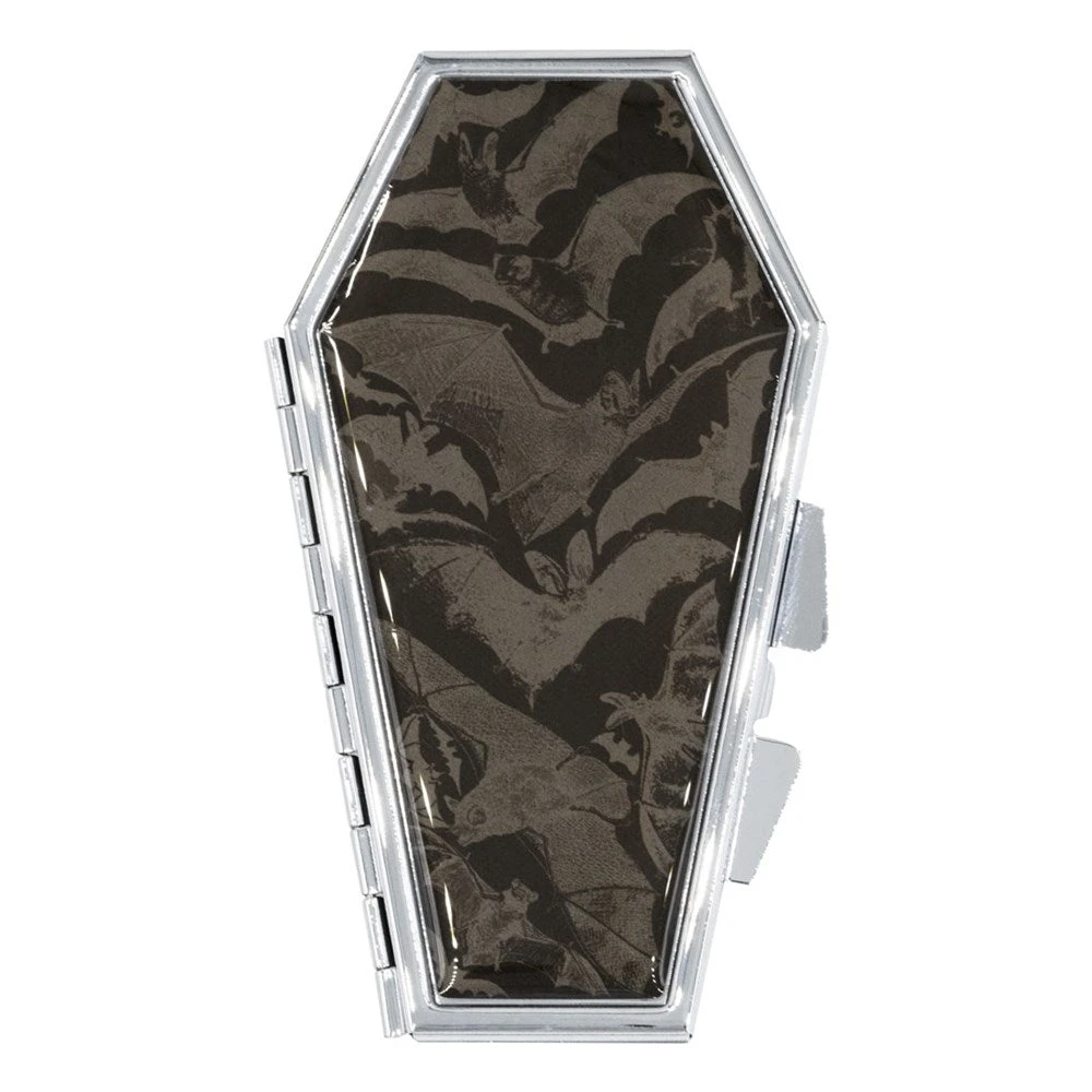 Mirror mirror for a doll be the ghoulest one of all. Even if you can’t see your reflection Kreepsville’s Realistic Bat coffin shaped compact mirror is perfect for checking your bat ears aren’t showing. This handy coffin compact includes one non-magnified mirror and one magnified mirror inside and fits perfectly in your purse or pocket so you can stay looking your best all through the night. Size approx 4 in. X 2 in. Designed in California.