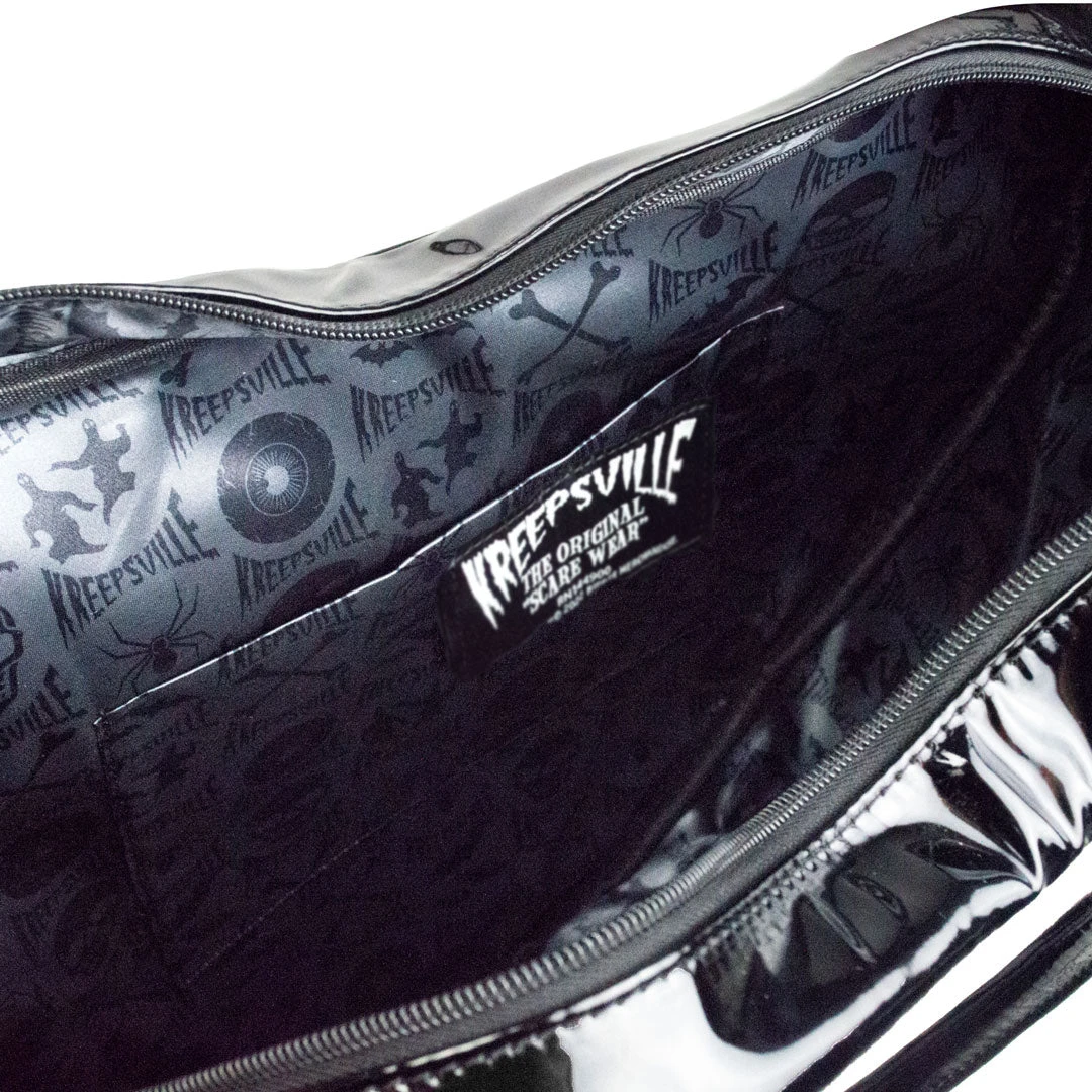 Everyday is halloween with our Pumpkin Glitter heart bag by Kreepsville! The spooktacular pumpkin design is adorned with glitter, adding a touch of sparkle to your everyday looks. Made out of shiny vegan PU leather, this stylish and roomy handbag with a large interior pocket and secure double zipper is perfect for carrying all your essentials while the Kreepsville satin lining adds a touch of extra flair. Complete with an adjustable and detachable shoulder strap turns this bag into a crossbody. Sizes approx: 14″ H (35.5 cm) x 17″ W (43 cm); interior 14″ H (35.5cm) x 8″ D (20 cm); handles 10.5″ inches (26.6 cm); strap 35.5″ inch (90 cm) can adjust up to 49.5″ inch (125.7cm).
