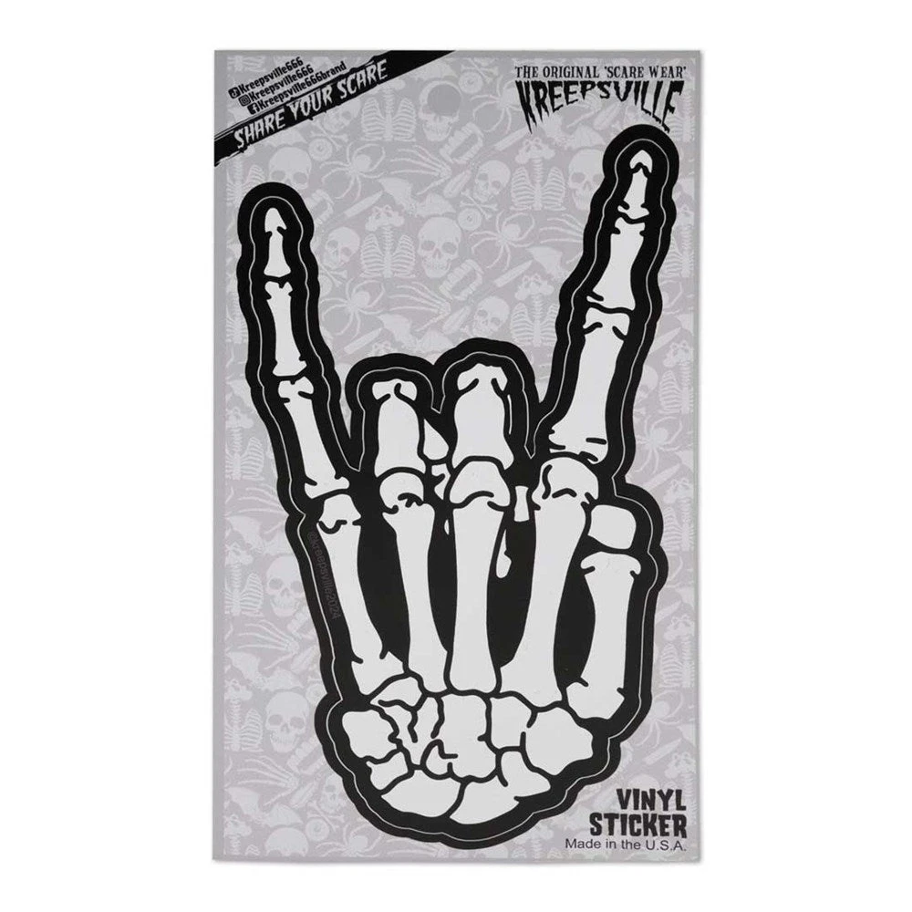 Rock out for all eternity with Kreepsville’s Skeleton Devil Hand Sticker. This skelli-sticker is made with a durable curse-resistant and water-resistant vinyl perfect for indoor or outdoor use. The acrylic-based permanent adhesive will easily stick to any surface: crypt, car, coffin, water bottle, skateboard, helmet, laptop, tablet, fridge, headphones, phone case, notebook, etc. Size approx. 4.9″ (12.5cm) x 2.6″ (6.8cm). Printed in the USA.