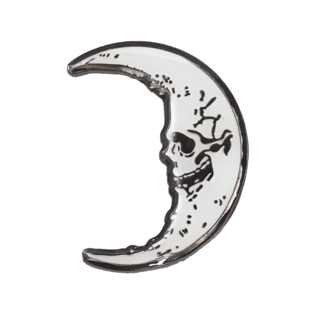 Kreepsville Skull Crescent Moon glow in the dark enamel pin, glowing in darkness skeleton bone white moon, size approx 2 inches (h) (5cm).