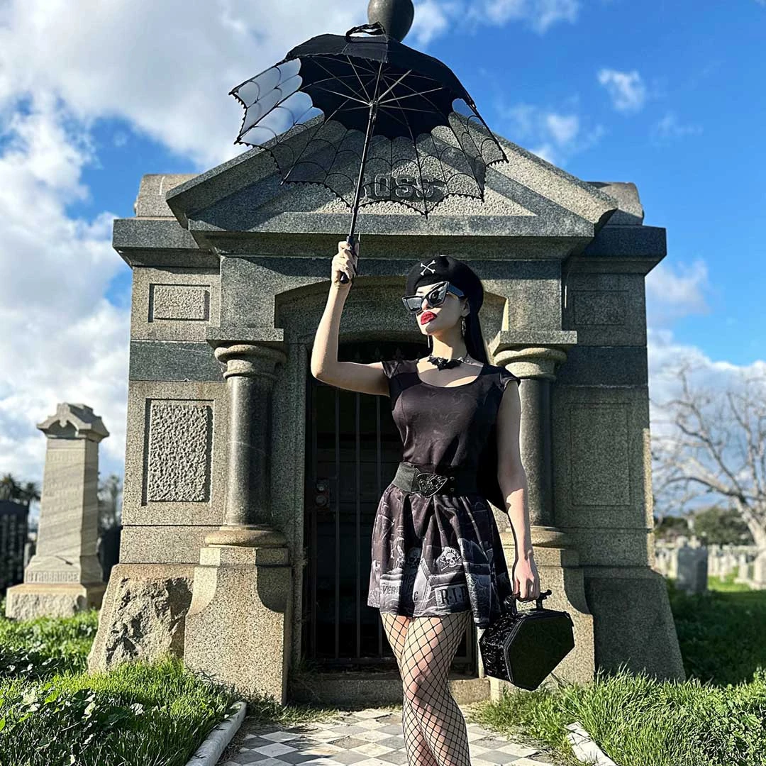 Spin your web with our Spiderweb Lace Parasol! Its unique design is perfect for adding a touch of gothic glamour to any outfit. The luxurious black lace is adorned with intricate spider web detail, while the comfortable wooden handle and fastener button strap make it easy to carry and keep securely closed. Parasol measures 26″(66 CM) tall 30″ (76.2 CM) wide when opened.