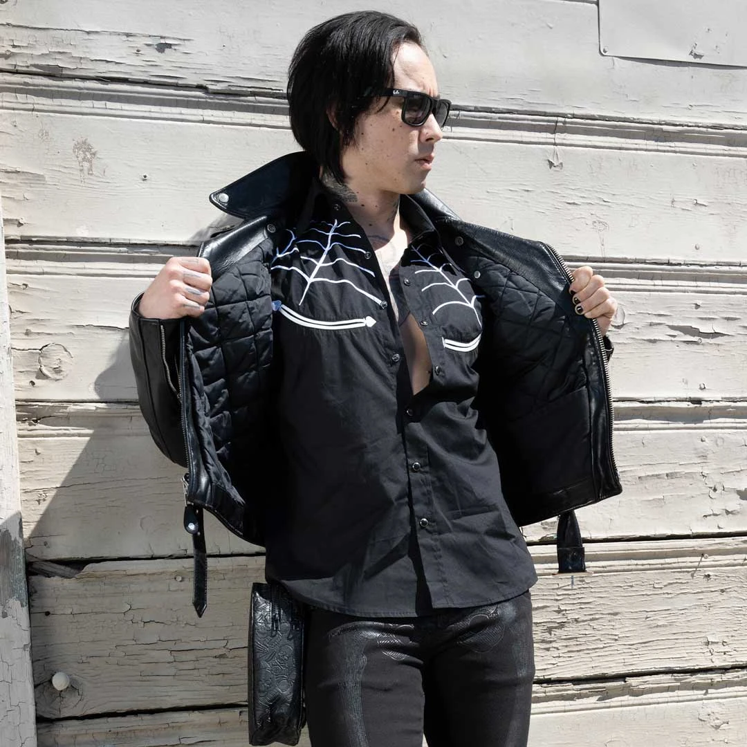 The Kreepsville Spiderweb White Western Shirt adds a dark twist to this classic western look. It features an embroidered white spiderweb design on the front and back along with black snap buttons and smile pockets. Crafted from a cotton poly blend fabric, this shirt has short sleeve detail that ensures comfort and breathability. Whether you’re adding it to your gothic western wardrobe or just looking for something edgy, this shirt is a signature staple in spooky western aesthetic.